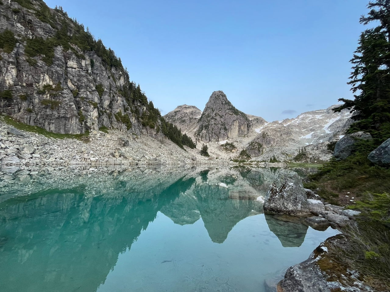 AllTrails labels the hike as Hard; I’d say it’s moderate with a hard part at the end where you have to scramble a bit over 3 sections of large rockslides. After being treated to all that beauty on the way, Watersprite Lake itself is quite the climax. What a gorgeous place. I don’t know how many wonderful shades of blue my eyes have been treated to since arriving in Canada, but this lake was a magnificent addition. It was so crystal clear that it had a gorgeous reflection, great material for some impressive photos.