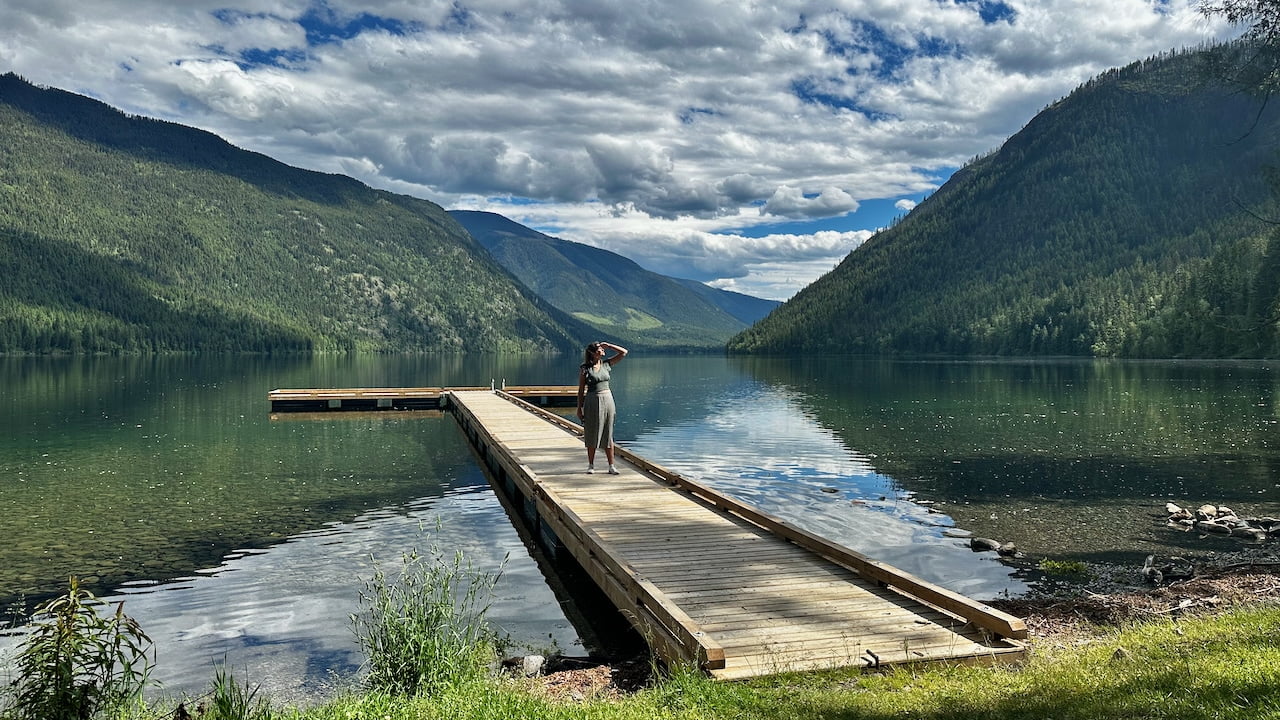 We picked out a place on Booking.com in the town of Clearwater. On the way there, we left highway 5 to go onto Dunn Lake Road. After a bumpy ride with no cell reception whatsoever, we finally made it to the Dunn Lake North Recreation Site. When the lake came into view, my mouth dropped. It was so quiet, serene, and humungous. There was not a soul around, just us and this huge chunk of nature. The sheer size is impossible to capture on camera, but below is my beautiful friend Melissa on the Dunn Lake dock.
