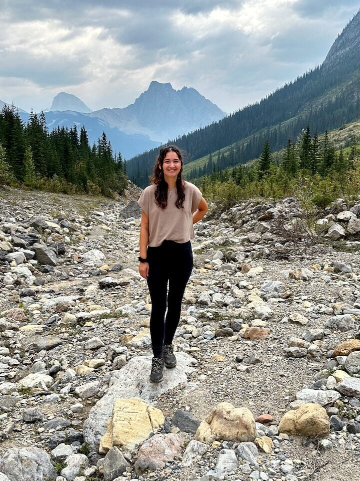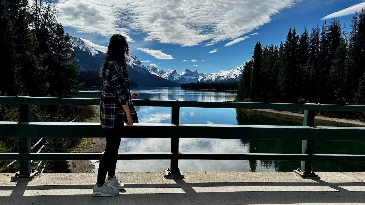 On my second trip to Jasper, I saw Maligne Lake for the first time. I couldn’t believe my eyes when we pulled up on this little bridge on our way to the hike we wanted to do. It looked like a painting, but to prove I was really there, here’s me blocking the view as I look over the Maligne River.