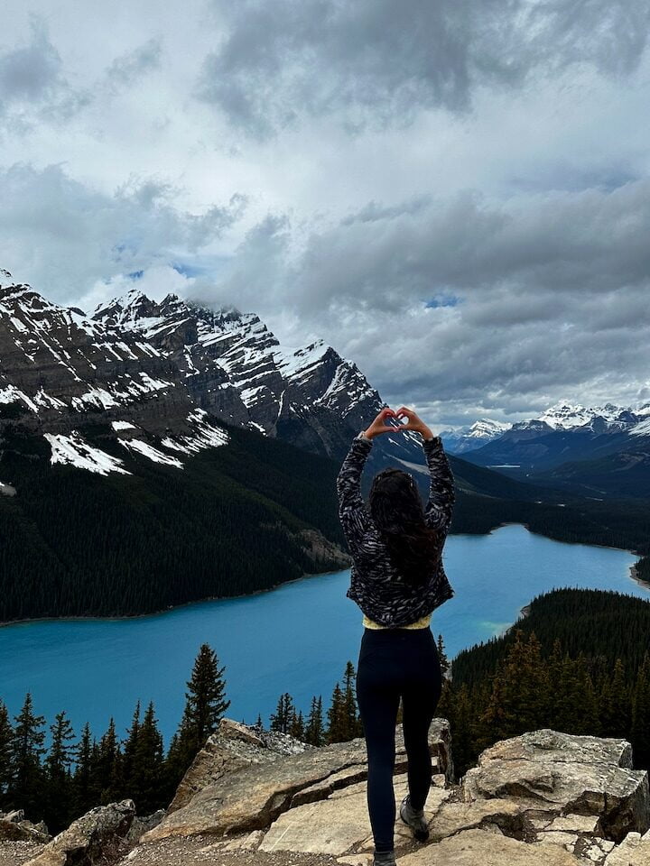 On my second trip to Jasper, I saw Maligne Lake for the first time. I couldn’t believe my eyes when we pulled up on this little bridge on our way to the hike we wanted to do. It looked like a painting, but to prove I was really there, here’s me blocking the view as I look over the Maligne River.